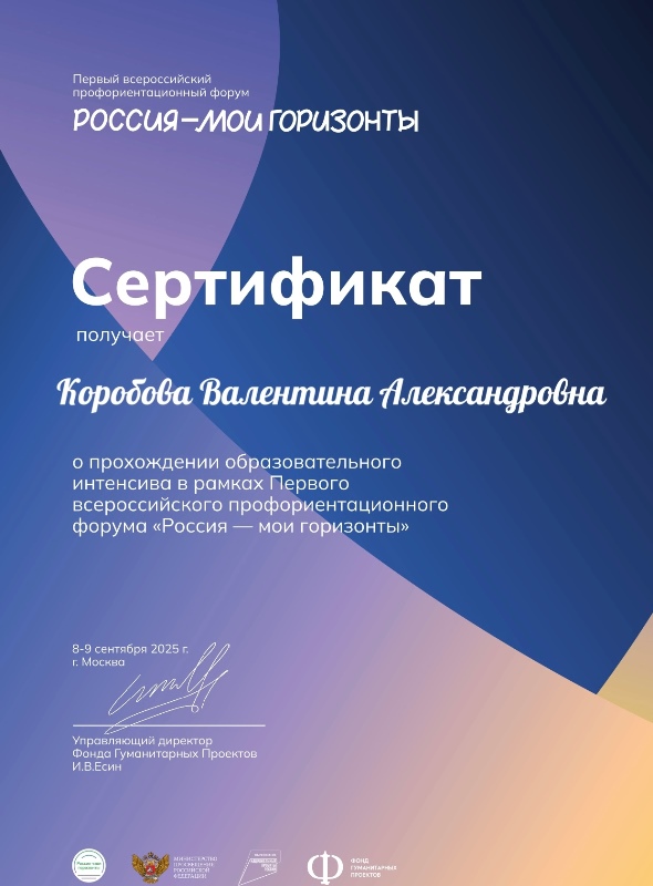 Сертификат участника "Первый всероссийский профориентационный форум "Россия - мои горизонты" Коробова Валентина Александровна, 2025 г.