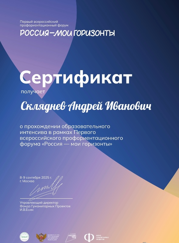 Сертификат участника "Первый всероссийский профориентационный форум "Россия - мои горизонты" Скляднев Андрей Иванович, 2025