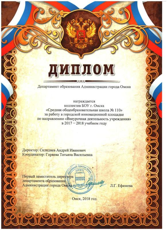 | 2019 — 2020 г.г. | БОУ г. Омска «Средняя общеобразовательная школа № 110» номинант Всероссийской профессионально-общественной инициативы «Сохранение социального здоровья нации» в 2019 году (Диплом номинанта) http://www.sznation.ru/publ/iniciativa_sszn/sokhranenie_socialnogo_zdorovja_nacii/91 |