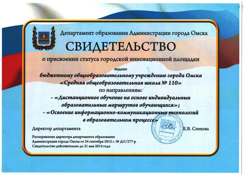Свидетельство о присвоении статуса инновационной площадки базовой и сетевой кафедры информатики и методики обучения информатике Бюджетное общеобразовательное учреждение города Омска «Средняя общеобразовательная школа № 110» по направлению